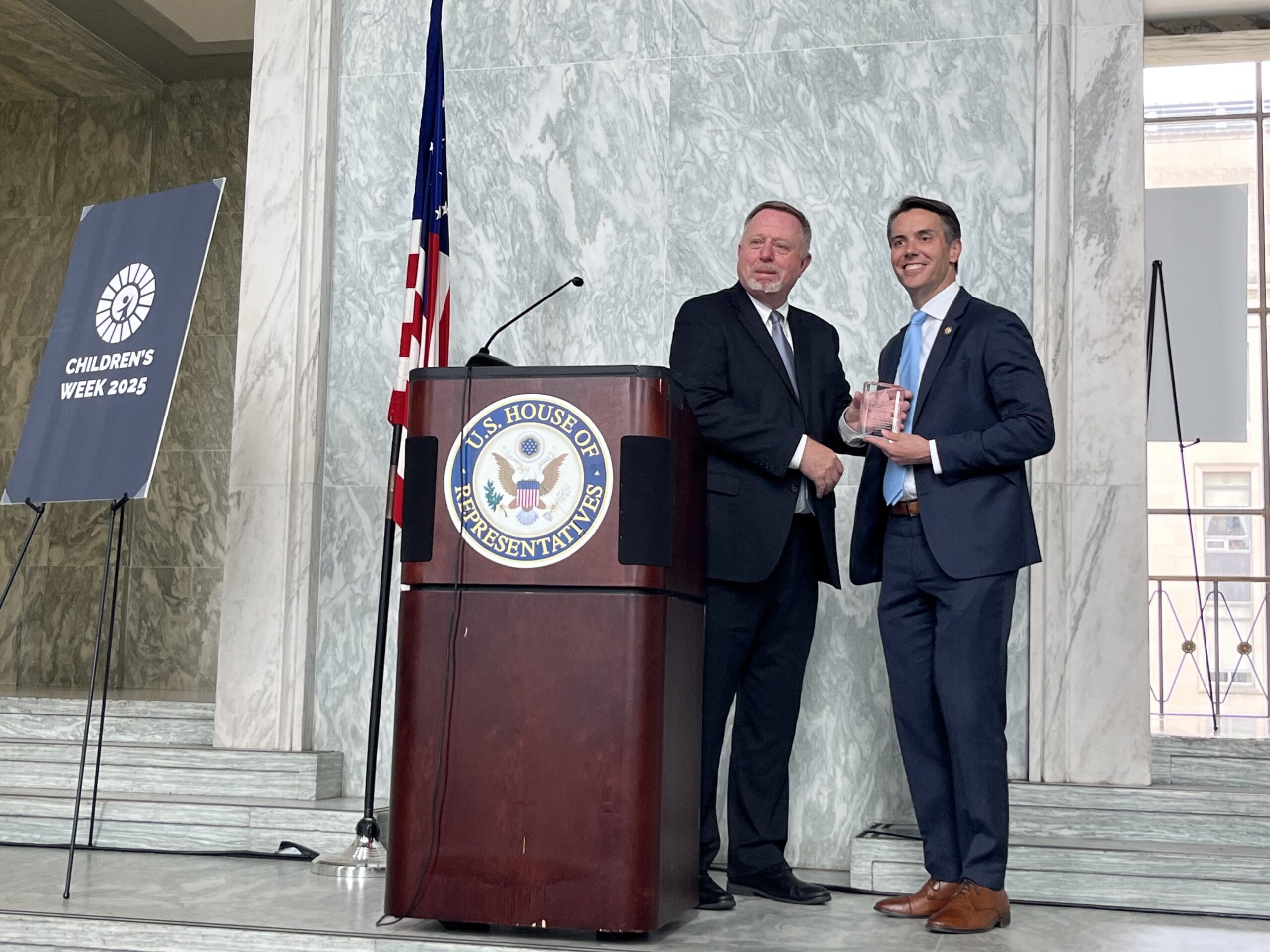 Rep. Morgan McGarvey of Kentucky receives his Champion for Children award from First Focus Campaign for Children President Bruce...