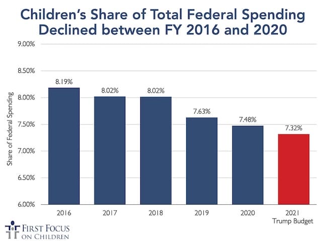 | U.S. investment in the nation’s children has fallen for the third year in a row, according to First Focus on Children’s recently released Children’s Budget 2024, and actions planned by the incoming Trump Administration threaten to accelerate that trend. The report finds that the U.S. allocates less than 9% of the federal budget to children — who make up roughly one-quarter of the population. Overall, U.S. investment in children has declined nearly 6% from Fiscal Year 2023, according to the report, largely driven by deep cuts to food assistance and other life-sustaining programs. But it’s been worse: namely, during the first Trump Administration. In 2019, under President Trump, the United States spent more servicing the national debt than it did on the nation’s children for the first time in history. By FY 2021, President Trump proposed eliminating 59 children’s programs, slashing $21 billion from their services, and reducing federal investment in children to just 7.32% of the budget, the lowest level since First Focus on Children began tracking in 2006. |