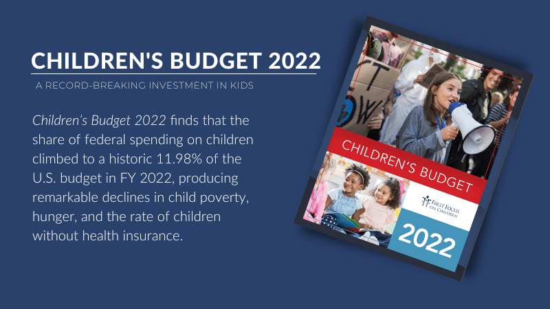 Children’s Budget 2022, released today, finds that the share of federal spending on children climbed to a historic 11.98% of the U.S. budget in FY 2022, producing remarkable declines in child poverty, hunger and the rate of children without health insurance.