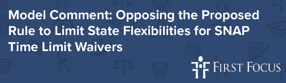 A recent proposed rule from the US Department of Agriculture would undermine that flexibility by tightening the requirements by which states can receive SNAP time-limit waivers for so-called Able Bodied Adults Without Dependents. However, this proposed rule would not just harm low-income adults facing barriers to employment. Instead, it will also have the unintended consequence of harming children and very vulnerable young adults. It is important for child advocates to submit comments by the deadline of April 2, 2019, to combat this harmful rule. Adapt the following model comment to voice your opposition to the USDA’s proposed changes.